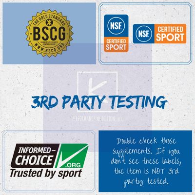 When you're looking to purchase a supplement, you want to ensure it is third party tested. What does this mean? A supplement that is third party tested has been through a rigorous testing process to verify the ingredients listed on the label are actually in the supplement. You will be able to determine this by the labeling on the container. Refer to the picture to the right for labels to look for. Most of the time you aren't going to find these supplements at a local nutrition store or a place like GNC.