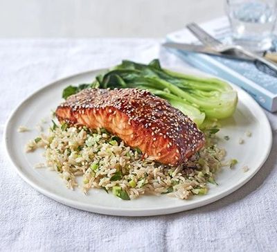 -1/2 plate of rice, 4 oz. salmon, green beans, and fruit
